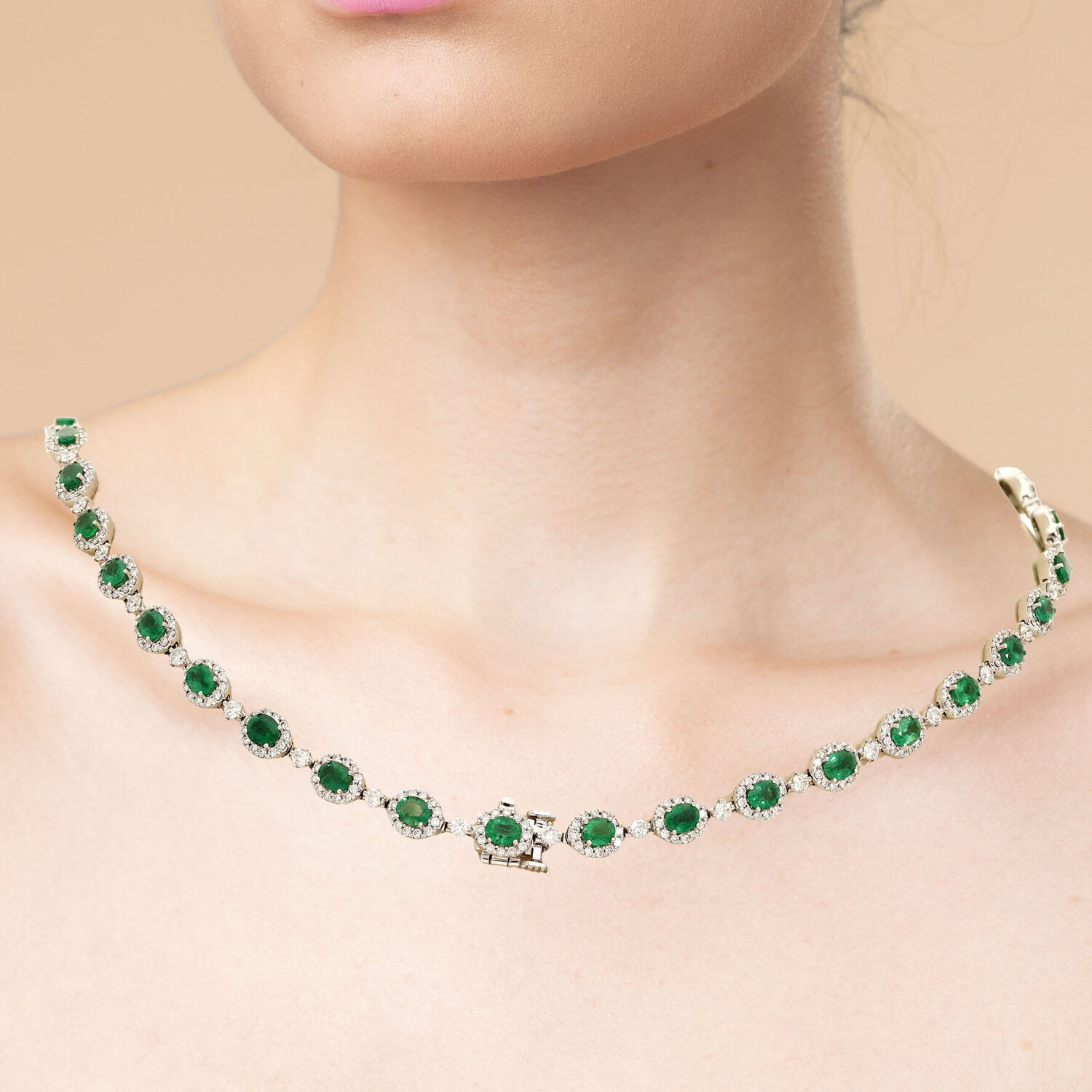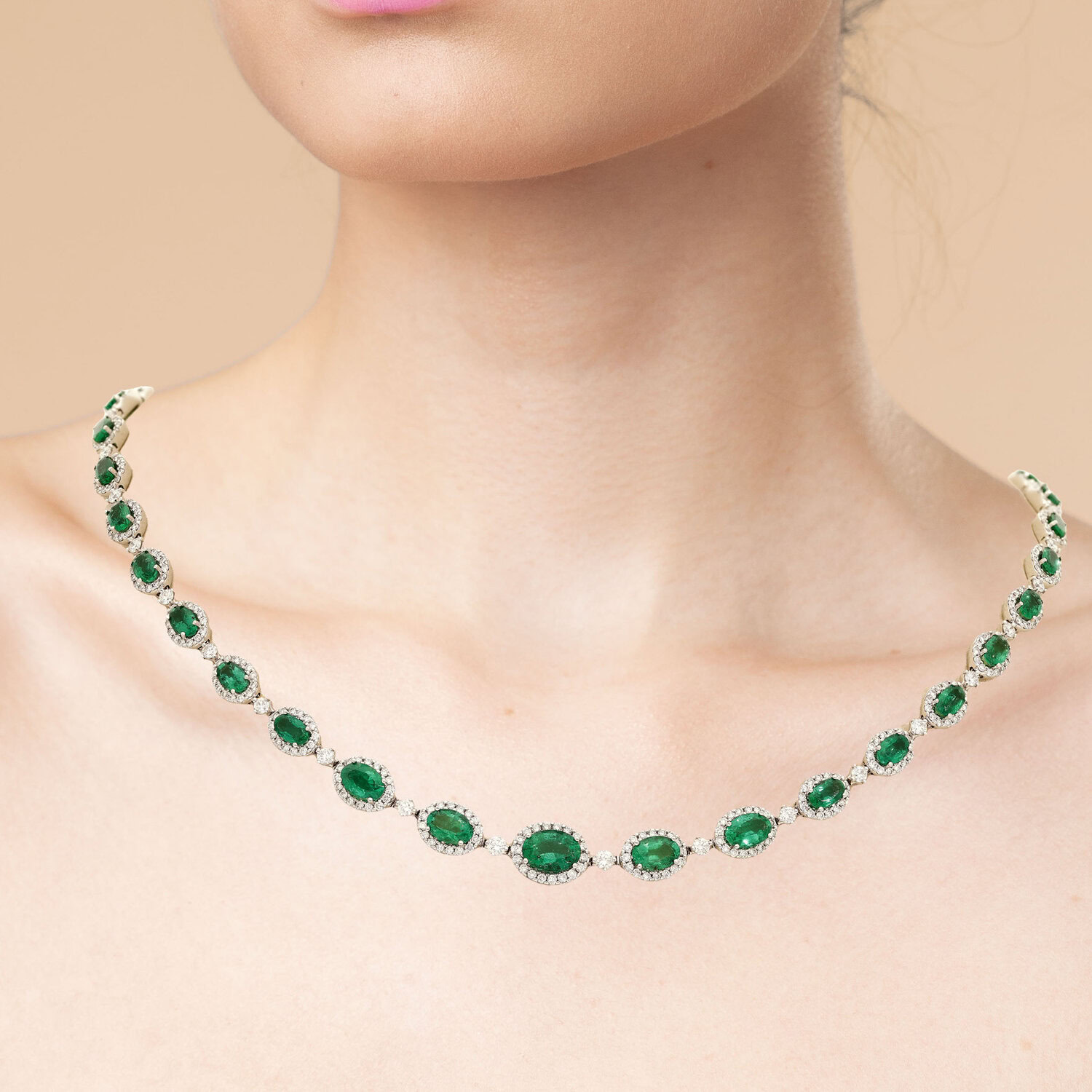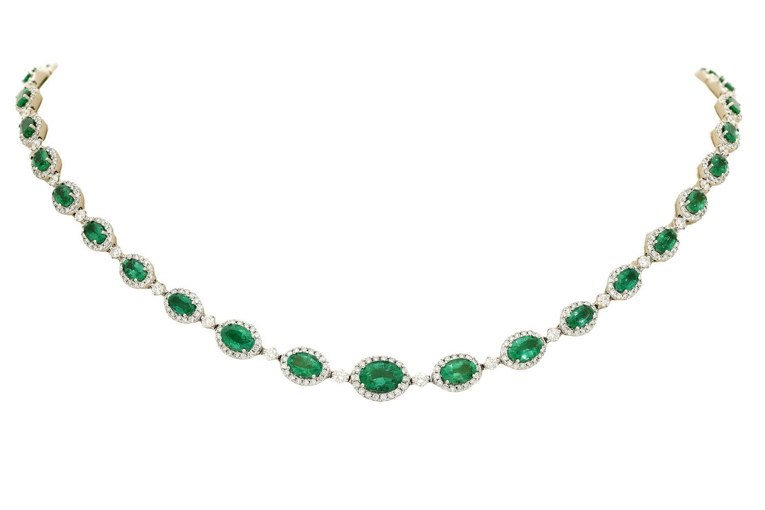 An 18K white gold emerald & diamond necklace with 39 Emerald totaling 9.35ctw and 565 round diamonds totaling 4.32ctw